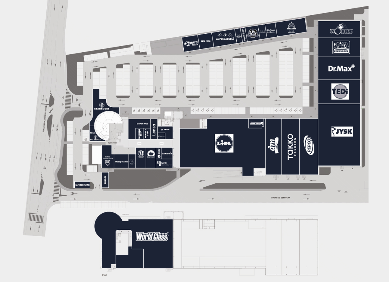 Superbet, Attitude, Starbucks, Casa berarilor, BT, Deichmann, dm, Barber Shop, 5 a sec, PetMag, Porto Gallo, Real Food, HOT Woks, Codrul Boieresc, Noriel, JYSK, Catena, Lidl, Dinner Food, Pizza Bonita, Maria Pharmamed, Pepco, Jerry’s Pizza, El Pescador, Alioli El Pescador, Alioli, Sensiblu, Beijing Garden, Sportisimo, Pasta Bar, Tabac Xpress, Takko, Tip Top, Wine Republic, World Class, Zora Cofetarie